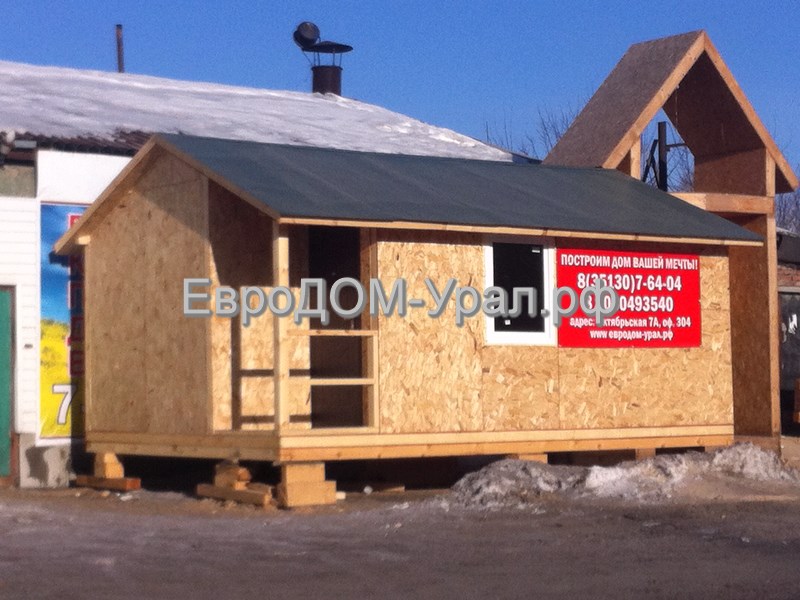 Размеры 6х4 (5,75х3,9) метра, одно окно, входная дверь, фундамент на винтовых сваях, сборка, кровля - крашеный профлист.