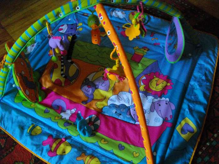 Коврик развивающий "Зоосад" фирмы Tiny Love - светомузыкальный развивающий коврик с игровым центром "Стукни и играй" .В комплекте музыкальный центр Kick&Play с двумя режимами работы, звучат голоса различных животных, а сами ладошки и ступни светятся. Есть второй режим работы - 15 мин звучит приятная музыка Моцарта. Коврик можно стирать. В комплекте: - 3 тканевых безопасных погремушки: утенок с бочонком-колокольчиком, жираф, львенок; - прорезыватель для зубов - 3 разноцветные бабочки на кольце держателе; - большое безопасное зеркало в мягкой оправе крепится ремешками на липучках. 1200р.тел.сот.8-952-509-81-90.